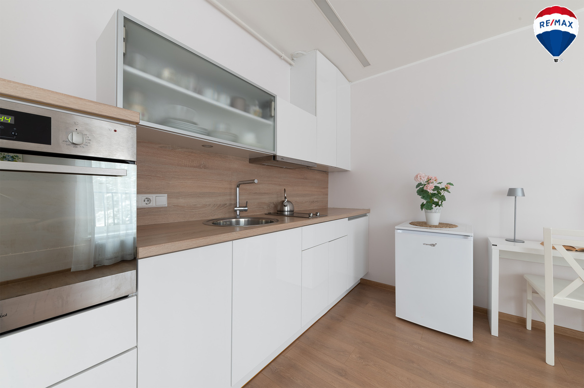 --Virtuvė su baldais ir buitine technika.