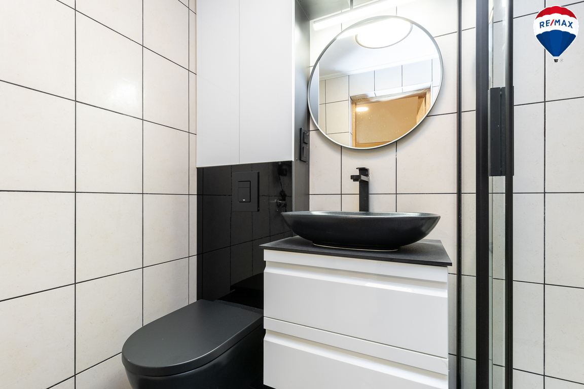 • Sienos ir lubos kambariuose dažytos, vonios kambaryje ir virtuvės zonoje – plytelės;