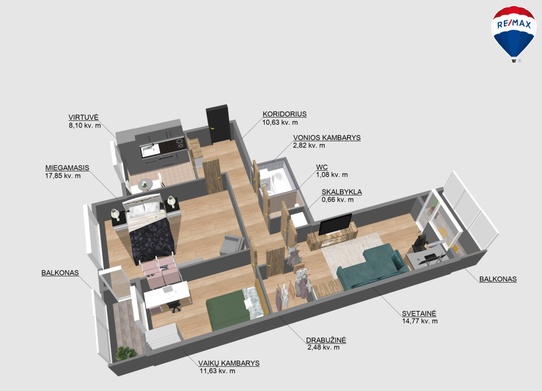 - Funkcionalus išplanavimas: drabužinė, tamsus kambariukas (tinkamas skalbyklai), du įstiklinti balkonai;