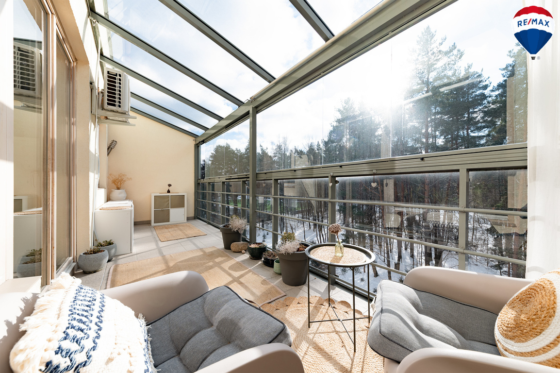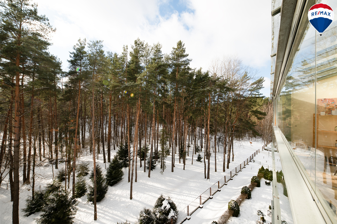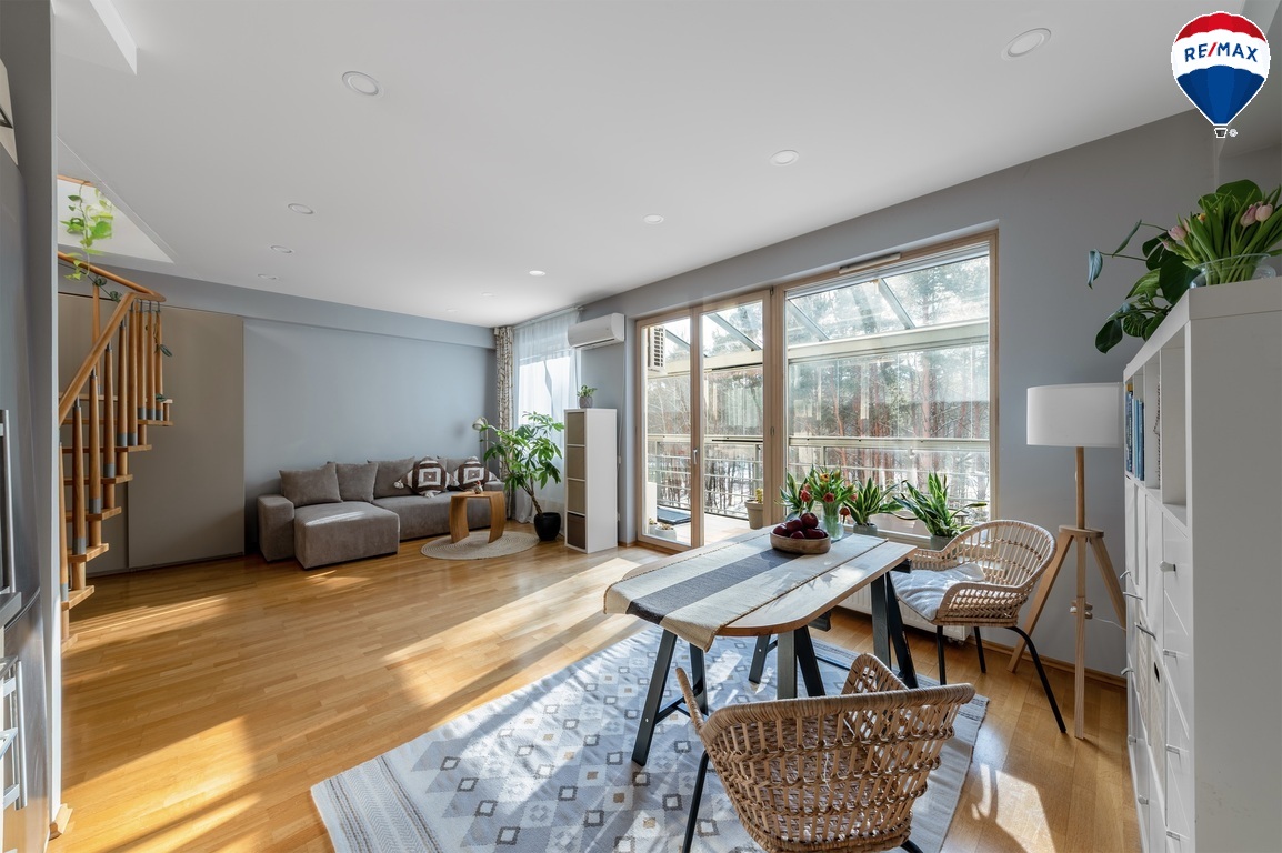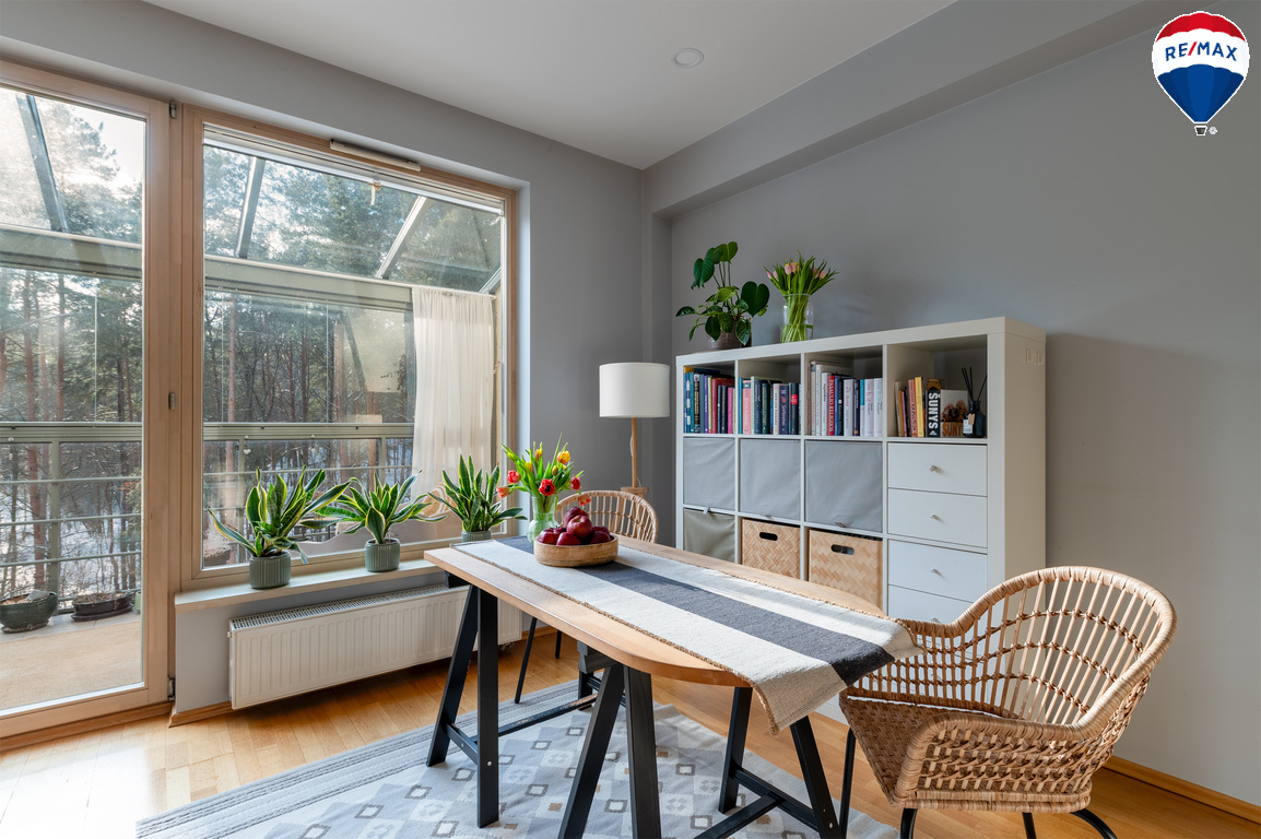 Ieškote namų, kur rytinė kava geriama žvelgiant į pušų viršūnes, o vakarai leidžiami terasoje miško ramybėje? Šis 2 aukštų butas Jonažolių g. – tai erdvės, privatumo ir gamtos dermė Vilniaus mieste.