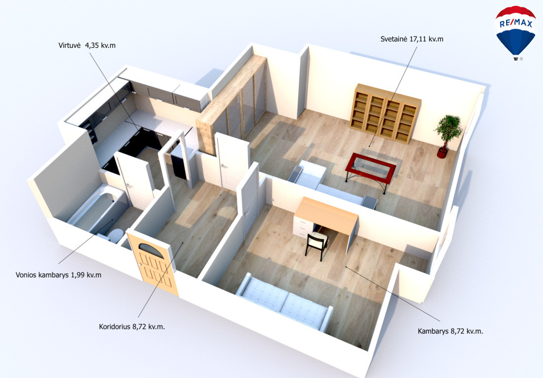 | Kambarių sk. 3 | Statybos metai 1940 m. | Plotas 36.89 m² | Aukštas 3/3 |