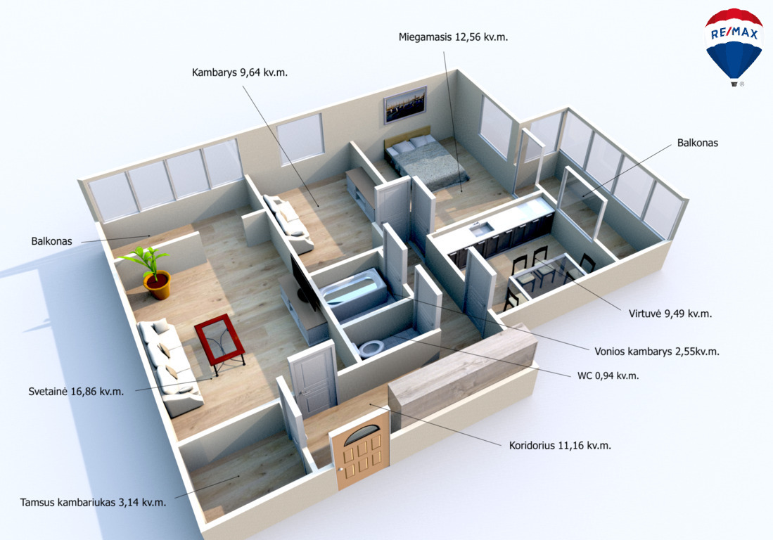 | Kambarių sk. 3 | Statybos metai 1989 m. | Plotas 66.43 m² | Aukštas 8/9 |