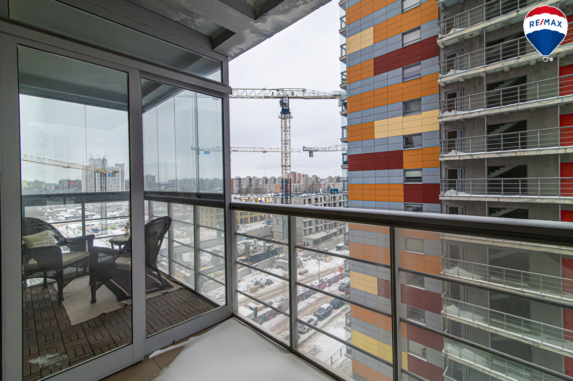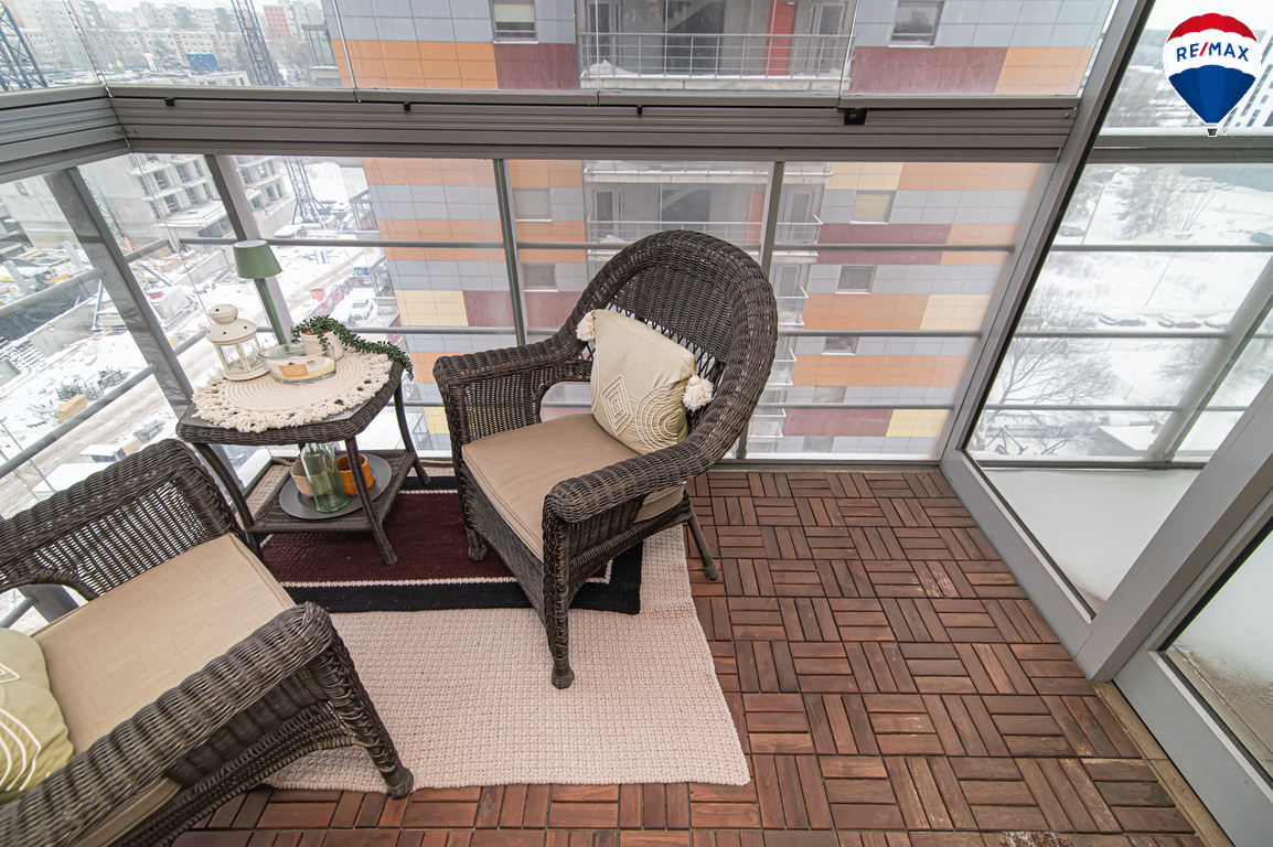 Didelis balkonas, kurio pusė įstiklinta – jauki erdvė naudojimui ištisus metus;