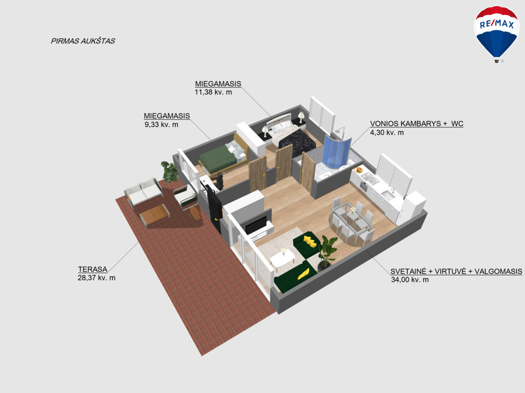 • 2 miegamieji (pagrindinis ir vaiko arba darbo kambarys);