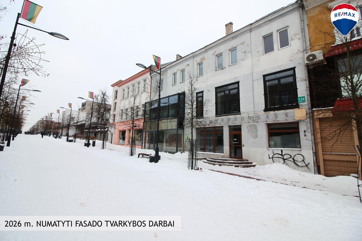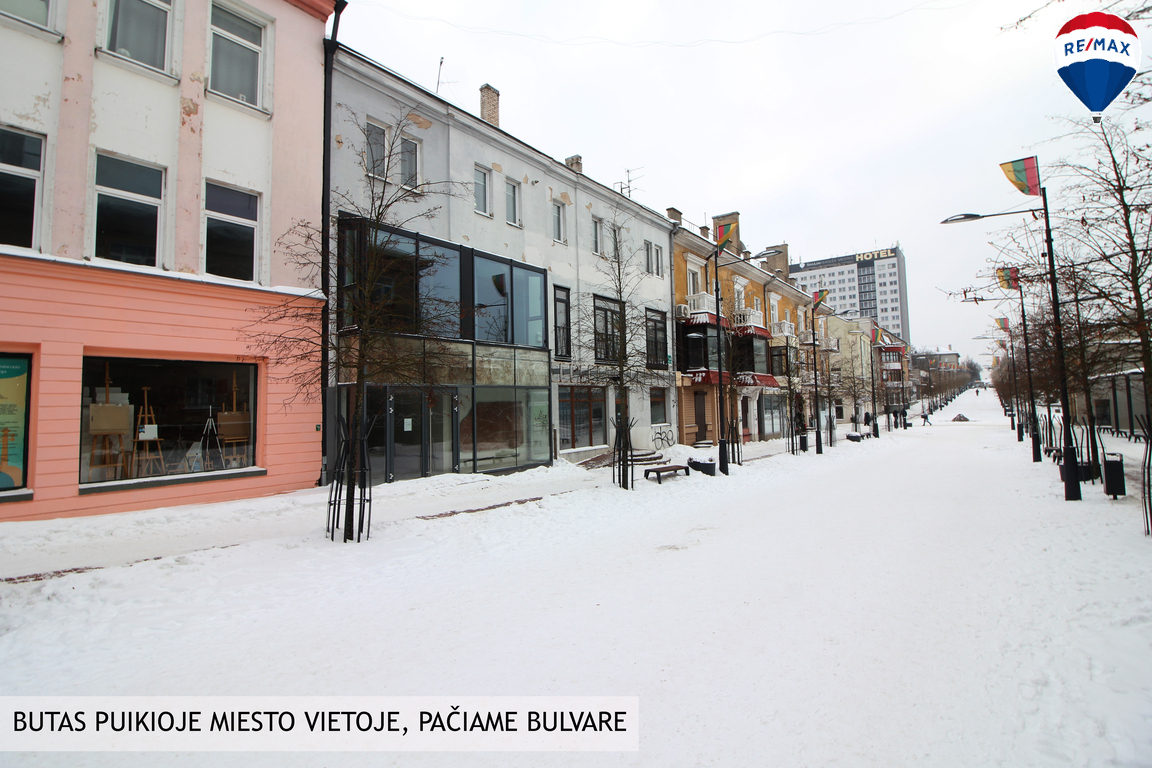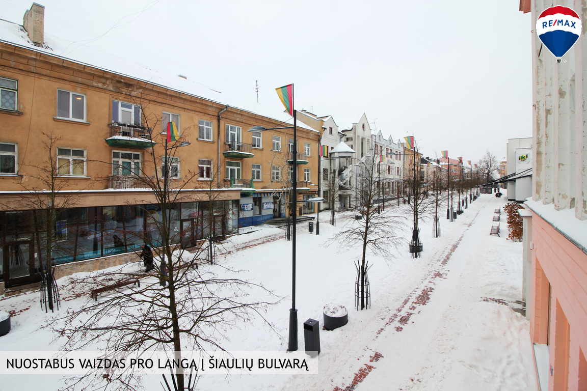 Pro vitrininius langus atsiveria nuostabus vaizdas į Šiaulių bulvarą, patenka daug saulės šviesos, tad butas nors ir išskirtinai erdvus, yra šviesus ir jaukus. Visi centro privalumai, ugdymo įstaigos, parduotuvės, vaikų būreliai lengvai pasiekiami pėstute, tai komfortiško gyvenimo ypatybė. Namo plotas miesto centre!