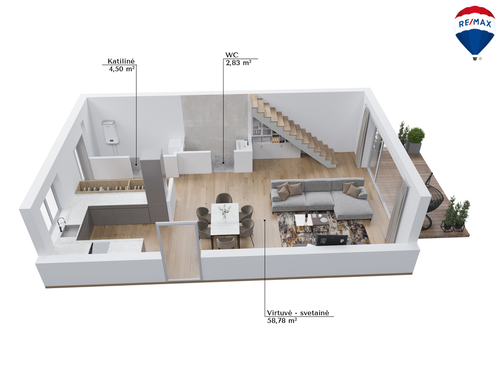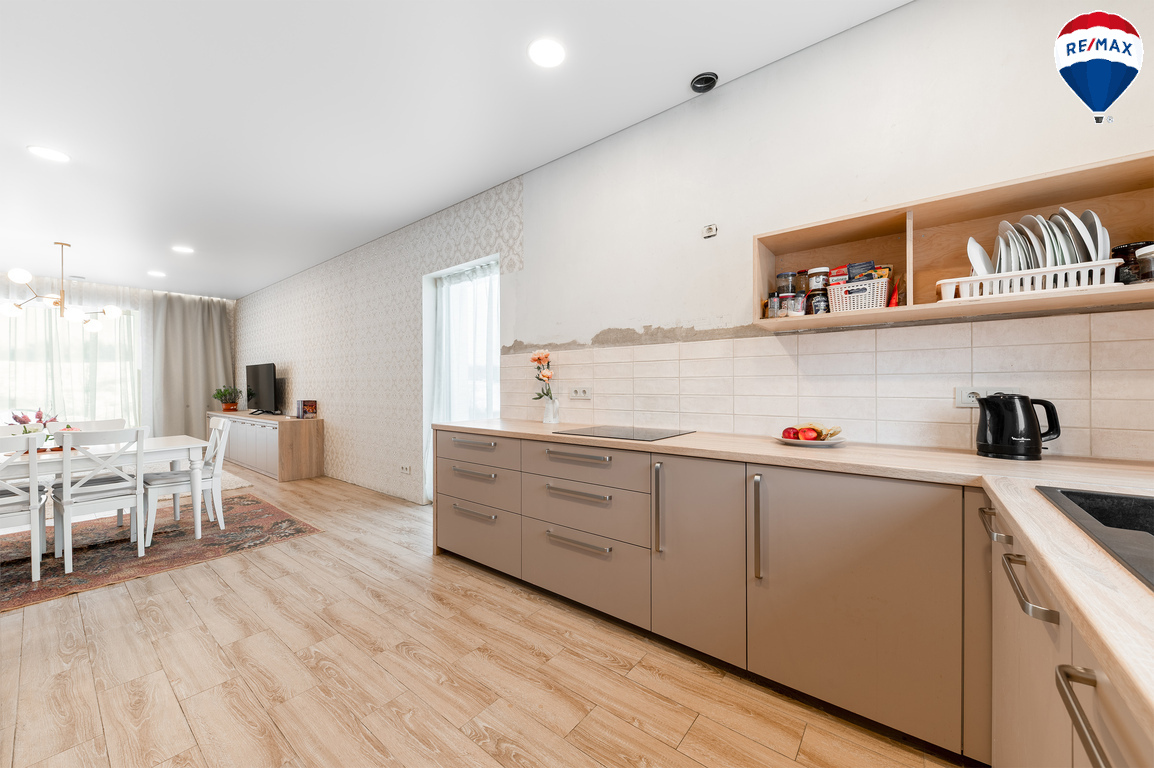 --Virtuvė sujungta su svetaine ir valgomojo zona;