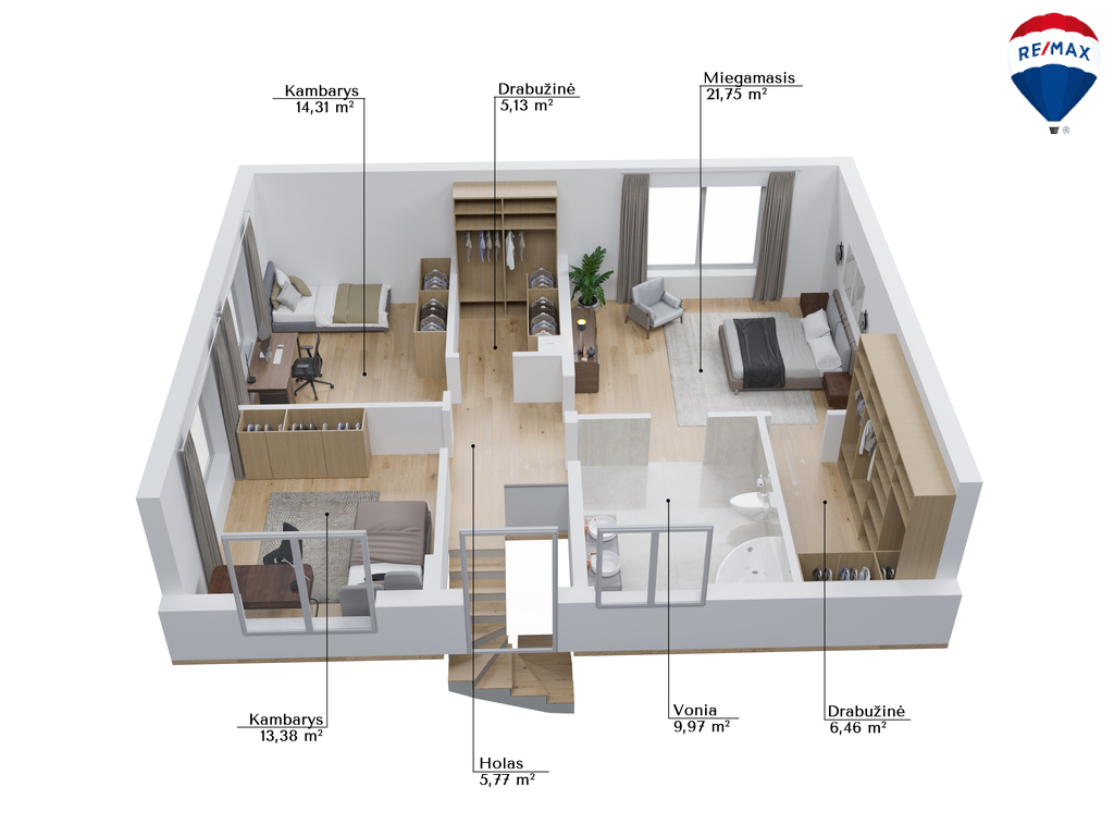 - Du vonios kambariai ir dvi erdvios drabužinės;