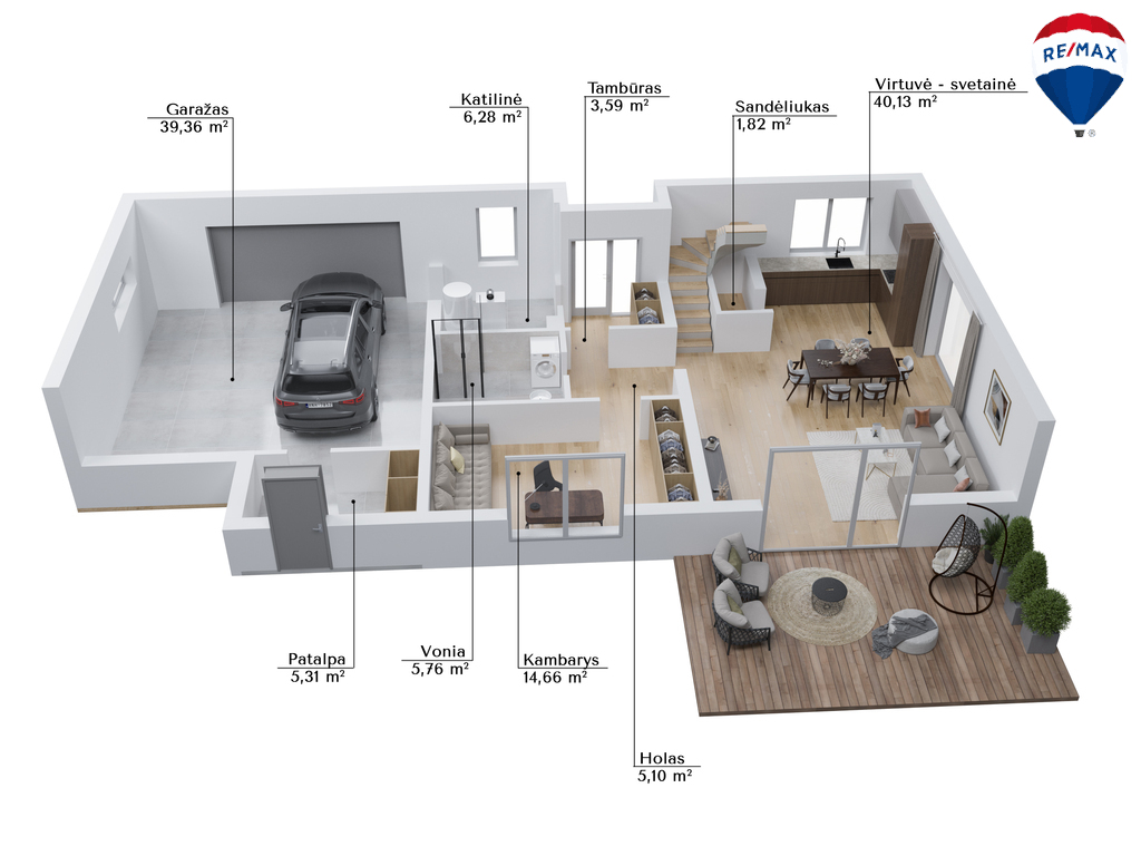 - Garažas, talpinantis net 2 automobilius;
